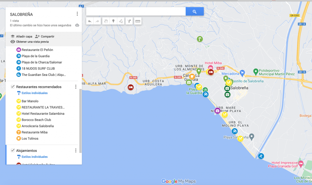 A continuación te comparto el mapa de Salobreña hecho con Google My Maps, en el que encontraréis los sitios de interés, restaurantes, alojamientos y demás lugares que os he recomendado, localizados y marcados:
