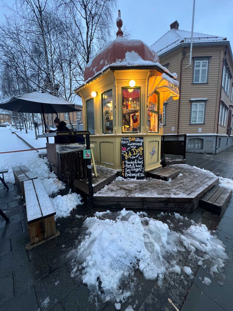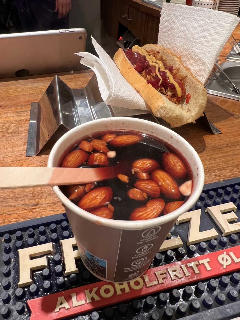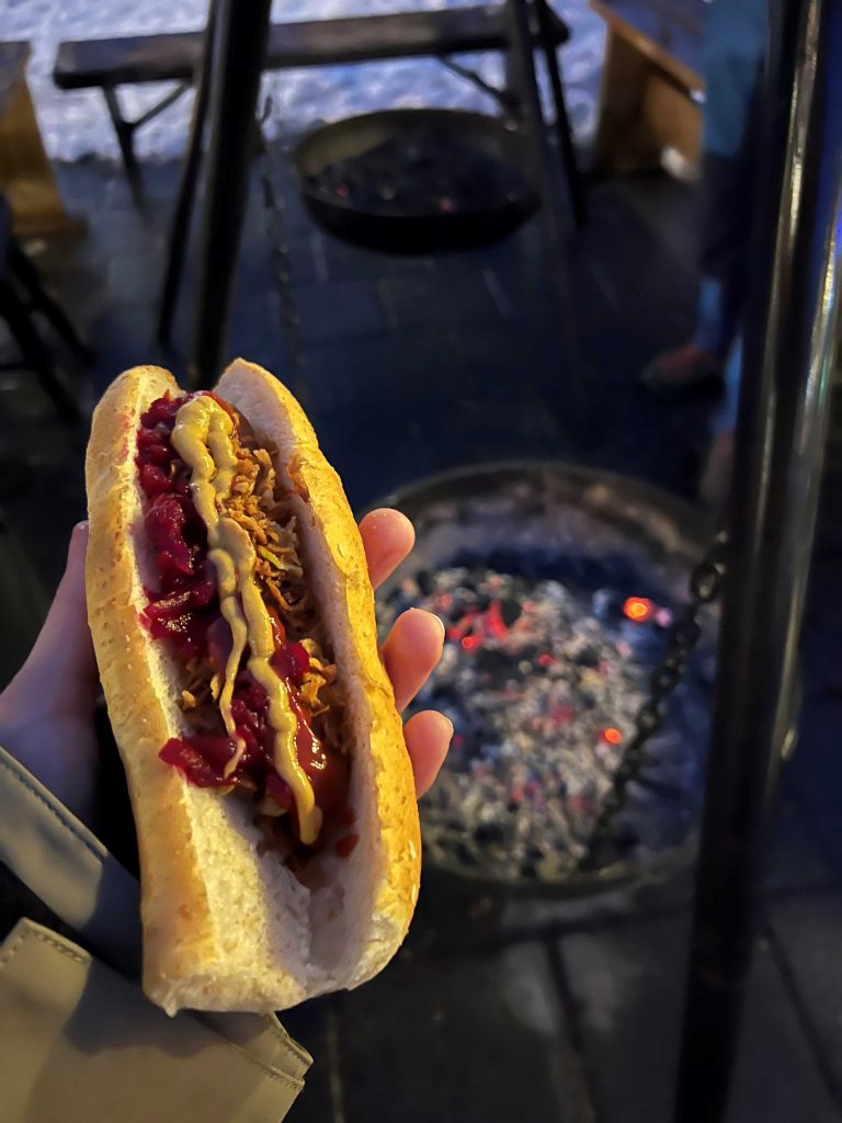 - Raketten Bar & Pølse: este pequeño y original “quiosco”, es conocido como “el bar más estrecho del mundo”. Y se trata de un pequeño puesto de comida en el que sirven frankfurts (tienen 4 tipos diferente) y vino caliente. Dispone además de una pequeña terraza con un par de hogueras con mucho encanto. Una buena opción para comer algo sin pagar excesivamente, y en un lugar emblemático como éste. Nosotros pedimos un frankfurt vegano (nos sorprendió gratamente ver que tenían opción veggie) y un vaso de vino caliente, que disfrutamos muchísimo.