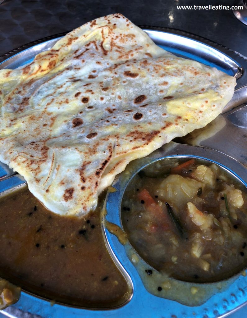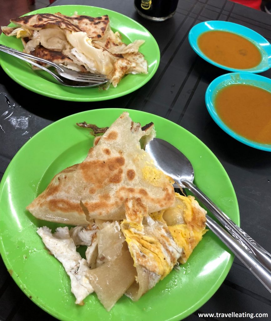 - Roti canai: tipo de pan circular y plano de origen hindú, muy típico en Malasia, que se cocina en una plancha. Hay quienes dicen que es la versión malaya de las tortitas, pues es muy común para desayunar. El original se acompaña generalmente de salsas de curry (normalmente en salsa curry de verduras o de lentejas, el conocido dhal), pero en algunos lugares encontraréis otras versiones. Nuestra favorita (a parte de la tradicional) es la versión con huevo, cebolla y queso. Aunque también hay versiones dulces todos los gustos. Y es que el roti es sin duda uno de los platos más buenos y baratos que probamos en Malasia. ¡Fue nuestro vicio durante el viaje! Ideal para desayunar o incluso para hacer una comida o cena rápida, buena y barata.