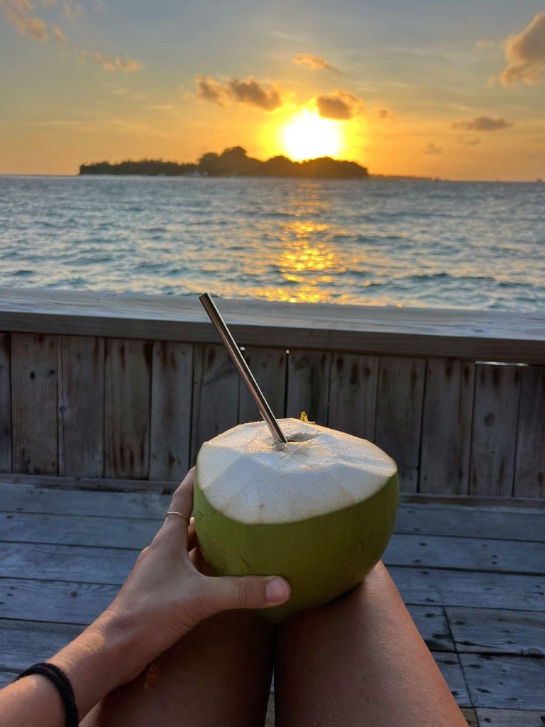 - Kurumba (coco fresco): la bebida por excelencia en Maldivas. Se trata del agua de coco joven, servida directamente del fruto. Es refrescante y natural. ¡Una de las mejores bebidas que te pueden dar en un destino paradisíaco como éste! Nada como estar frente al mar con un coco fresco en la mano.
