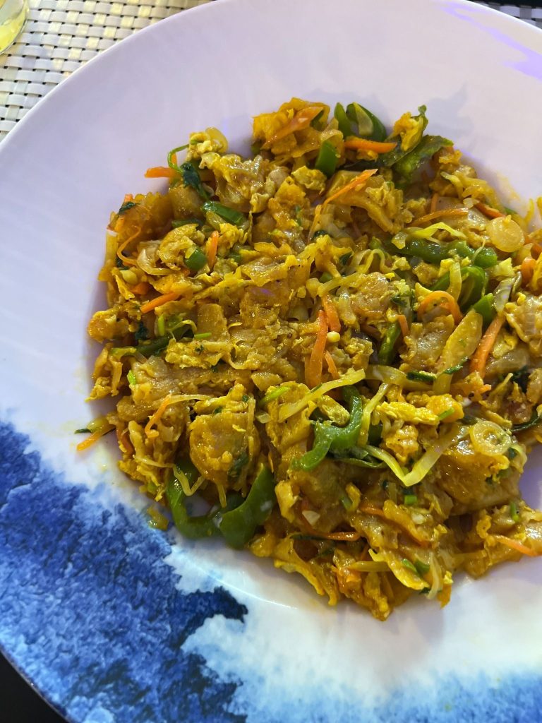 - Kottu roshi: aunque tiene origen en Sri Lanka, el kottu roshi es muy popular en Maldivas, especialmente en islas locales. Se elabora troceando pan roshi y salteándolo con verduras, huevo y, en algunos casos, añadiendo pollo o atún, junto con especias. Es un plato muy sabroso y contundente. ¡Sin duda nuestro favorito! Además, suele ser una opción bastante económica y fácil de encontrar en restaurantes locales.